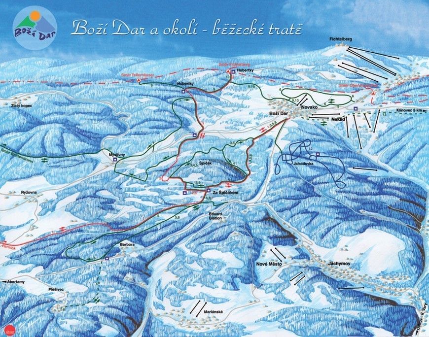 In total, there are approx. 146 km of trails around Boží Dar, which extend right down to the German border. Thanks to the ideal location, the region can benefit from early snowfall, whereby pleasurable cross-country skiing can be enjoyed especially long. The trails extend from 1 km to approx. 20 km length, some are round courses or parts of the "Skimagistrale Erzgebirge", a very popular long distance ski hiking trail over the entire Ore Mountain massif.