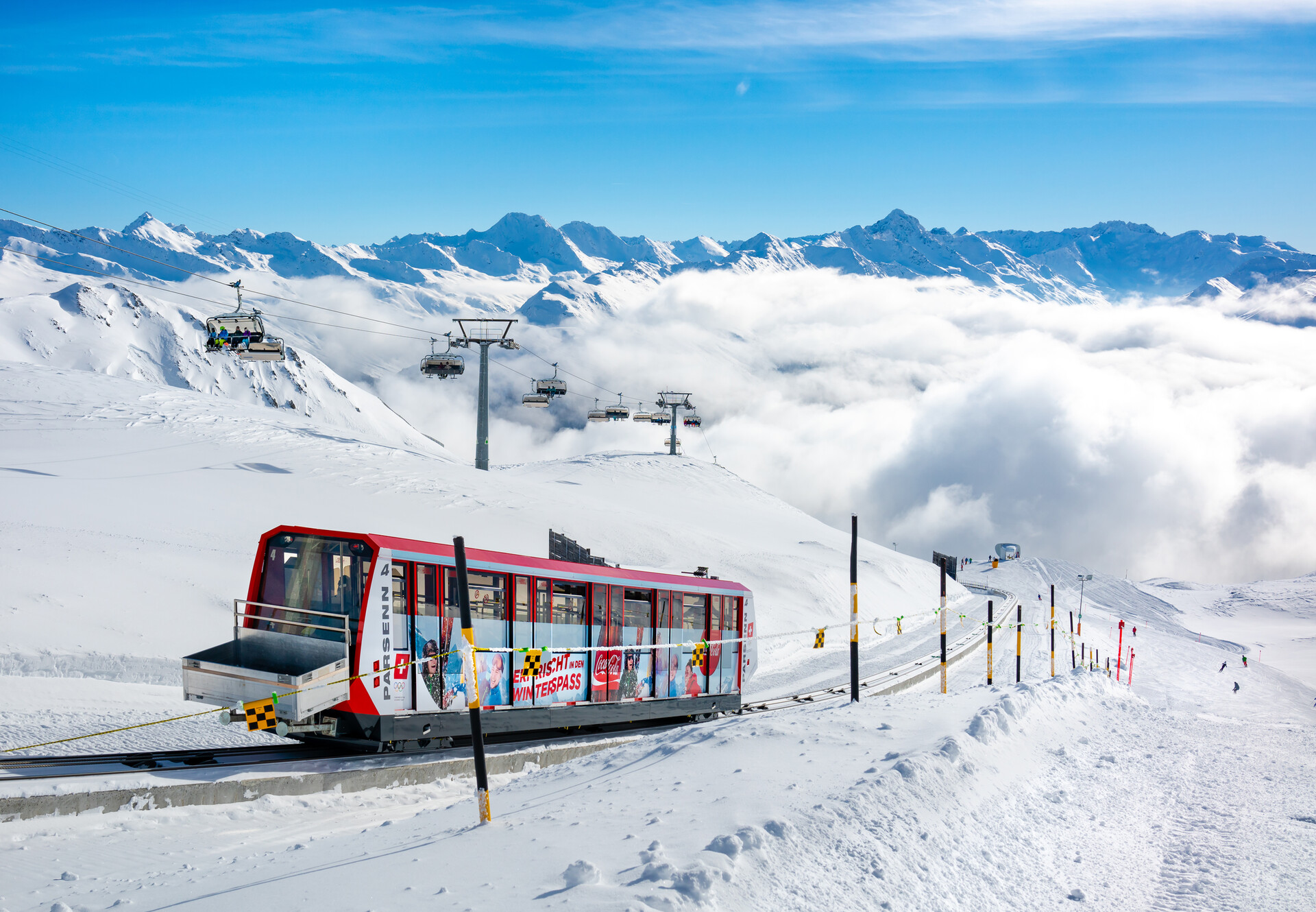 The Parsennbahn is one of the most famous funicular railways in the Alps. For over 90 years, skiers and snowboarders have been transported from Davos Dorf to the Weissfluhjoch on the 4 km long route, which consists of two sections. There, the facility, which was modernised in 2002, opens up the heart of the Davos Klosters Mountains ski area with its 211 kilometres of slopes at an altitude of up to 2,844 m.