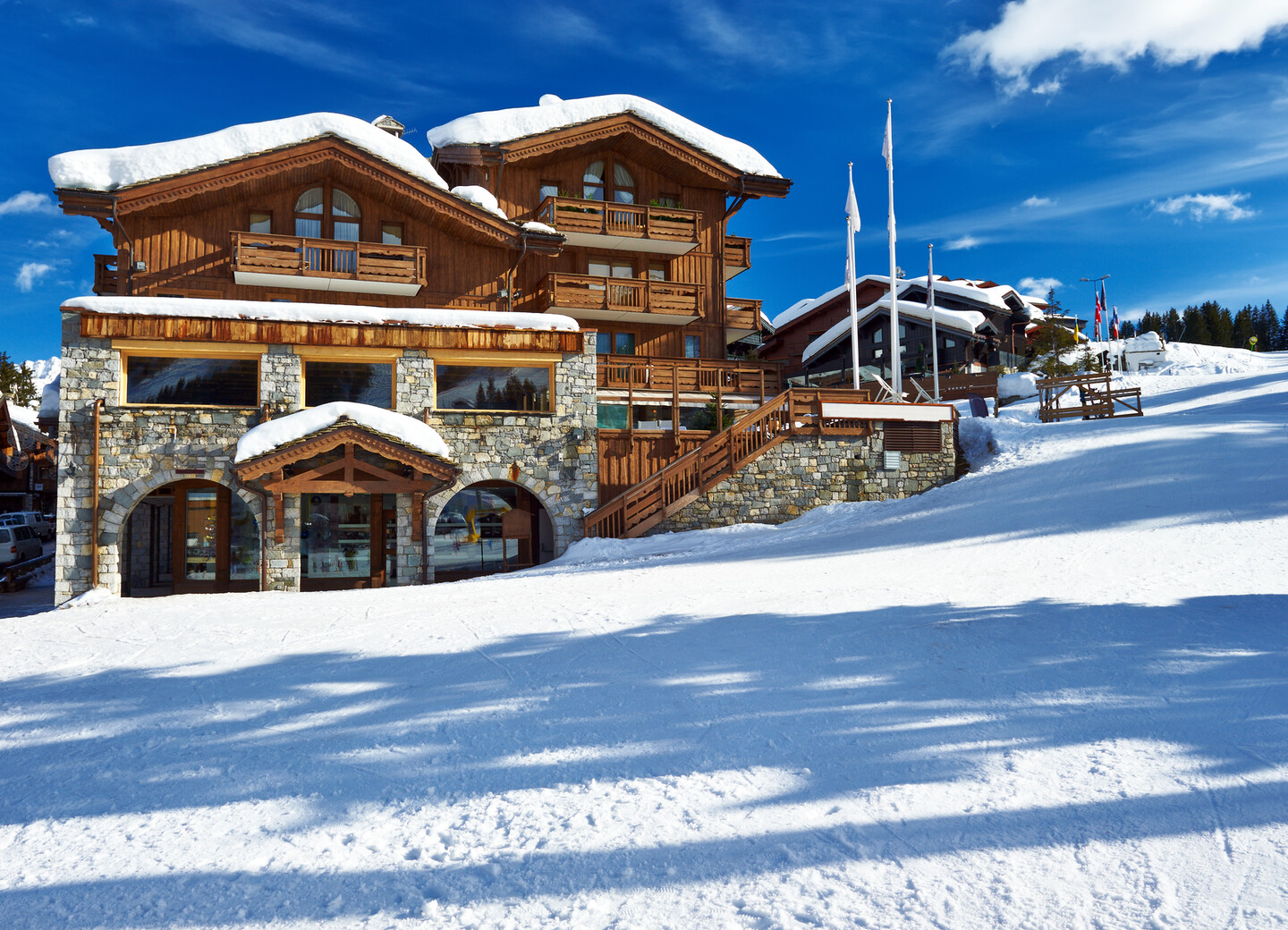 The popular winter sports resort of Courchevel is also situated within the vast French ski area of Les 3 Vallées. Like many other ski resorts in France, this resort was built specifically for winter sports. Courchevel differs, however, from the classic French mountain village, as no concrete blocks or mass accommodation were built here after the Second World War; instead, the townscape is characterised by chalets and luxury hotels. Wealthy celebrities spend their holidays in one of the nearly two dozen 5-star hotels and indulge in culinary delights at Michelin-starred restaurants such as ‘1947’ at the Hotel Cheval Blanc.